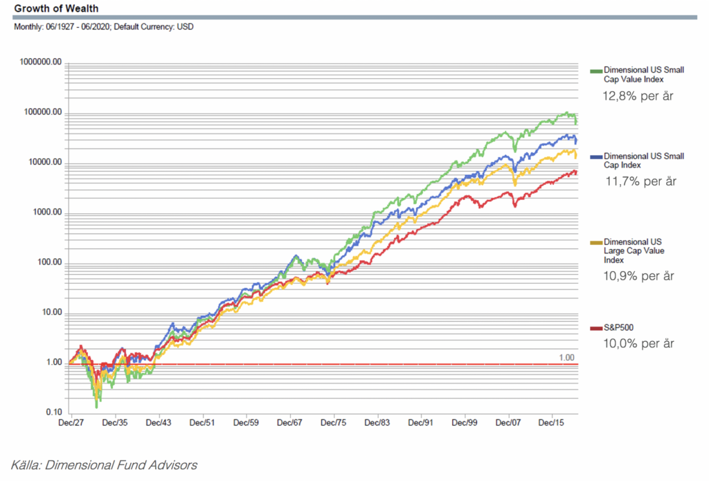 Forskning inom finansiell ekonomi har visat att vi skall förvänta oss högre avkastning från ett antal faktorer. Den mest väletablerade är att aktiemarknaden ger högre förväntad avkastning än säkra räntepapper. Andra faktorer är att småbolag ger högre förväntad avkastning än storbolag, att värdebolag1 ger högre förväntad avkastning än tillväxtbolag och att höglönsamma bolag ger högre förväntad avkastning än låglönsamma. Dessa samband har visats med vetenskaplig metod och gäller för alla regioner och branscher och baseras på data så långt tillbaka som tillförlitliga siffror finns2 . Bilden nedan sammanfattar väl utvecklingen över tid, där ett index av små värdebolag gett en snittavkastning om 12,8% per år jämfört med S&P 500 (10%) sedan 1927. I kronor räknat skulle en investerad krona i små värdebolag 1927 vuxit till 73 240kr idag, medan en krona i S&P 500 endast skulle varit värd 7 072kr idag, alltså en tiondel.