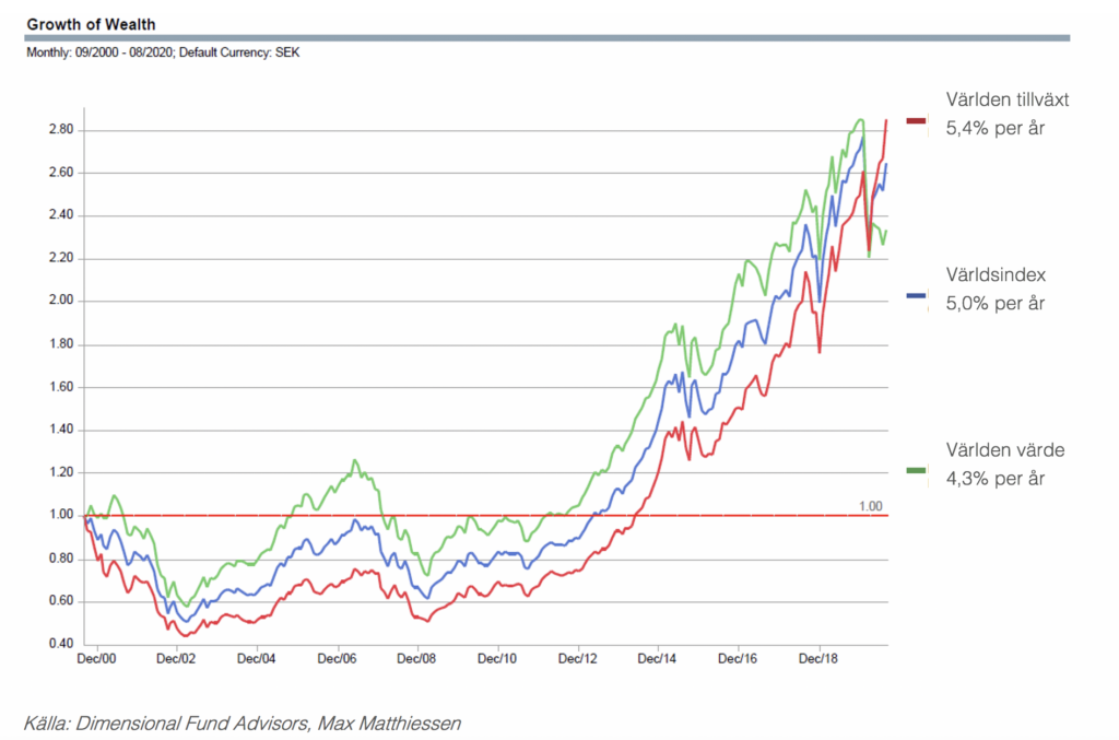 Vi är för närvarande inne i en period då vissa av de etablerade faktorerna inte har levererat överavkastning. På den amerikanska aktiemarknaden har exempelvis småbolag underpresterat storbolag under ca 7 år, medan småbolag haft en högre avkastning än storbolag i Europa motsvarande period. Den senaste tidens kraftiga börsuppgångar i USA har drivits av ett mycket begränsat antal stora tillväxtbolag såsom t ex Amazon, Google, Apple, Microsoft och Tesla. Tillväxtbolag har som grupp presterat bättre än värdebolag under en lång rad av år, inte bara i USA. Över den senaste 20-årsperioden har globala tillväxtbolag gett en snittavkastning om 5,4% per år, medan världsindex gett 5,0% och värdebolag 4,3% per år. Avkastningen har kommit till ungefär samma risk (ca 13,5% volatilitet). Större delen av överavkastningen för tillväxtbolag har kommit de senaste tio åren.