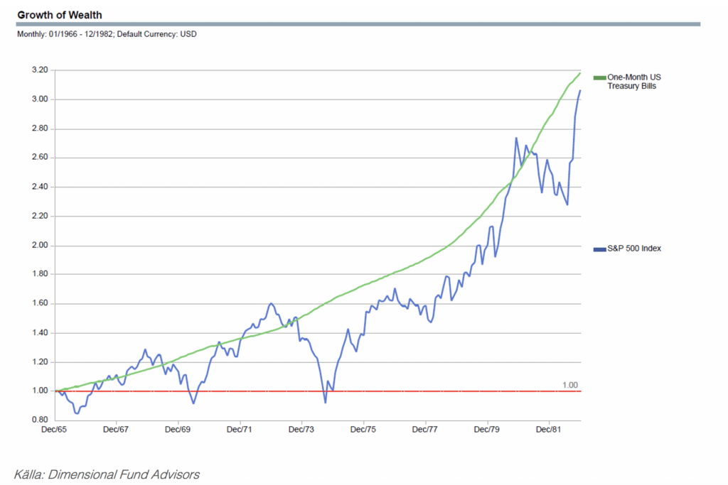 Aktiemarknadens riskpremie innebär att aktier, som är mer riskfyllt, förväntas ge högre avkastning än säkra räntepapper. Under perioden 1966-1982 (17 år) levererade korta säkra räntepapper i USA (Treasury bills) en genomsnittlig årlig avkastning om 7,0%, medan aktiemarknaden (S&P 500) gav en årlig avkastning i snitt om 6,8%, till betydligt högre risk.