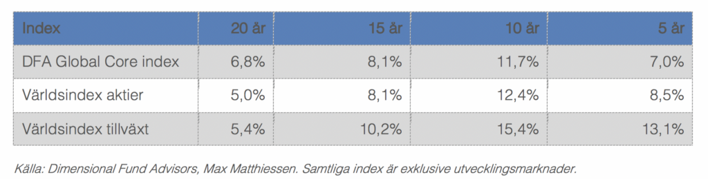 Om man lutar sig mot evidensen och diversierar brett istället för att försöka ha rätt i över 80% av sina investeringar, vilken avkastning skulle man då ha fått under de senaste tjugo åren? För att belysa detta jämför vi ett index som skall reflektera forskningens faktorer (DFA Global Core index) med världsindex samt världsindex tillväxtaktier. Tabellen nedan visar de olika kategoriernas årliga avkastning på 20, 15, 10 samt 5 års sikt mellan 2000 och 2020.